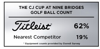 Of the 78 players in the limited field at this week's CJ Cup, 62% are trusting a Titleist Pro V1 or Pro V1x golf ball for their success, more than four times the nearest competitor with 19% and more than all competitors combined.*